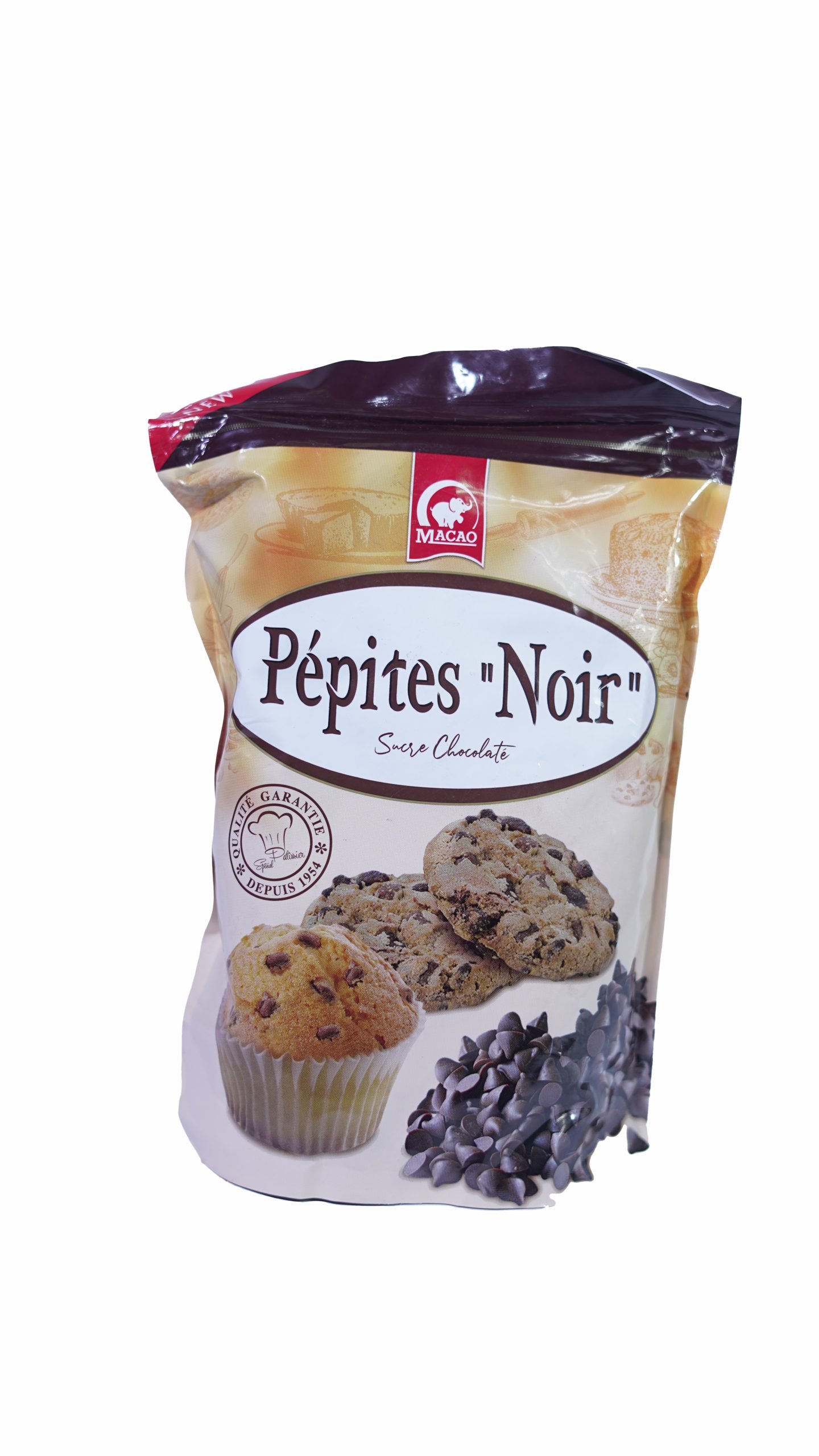 Pépites de chocolat noir Macao, idéales pour les cookies, muffins et décors de pâtisserie. Résistantes à la cuisson.